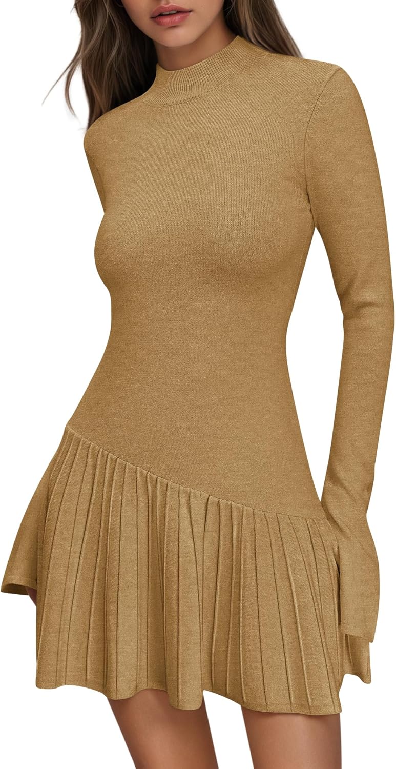 • 【Design】Women’s Sweater Dresses Features Mock Turtle Neck, Soild Color, Cute Bell Long Sleeve, Slim Fit, Ribbed Knit Short Dress, Sexy Pleated Hem. The Casual Bodycon Dress Keeps It Trendy and Warmth.